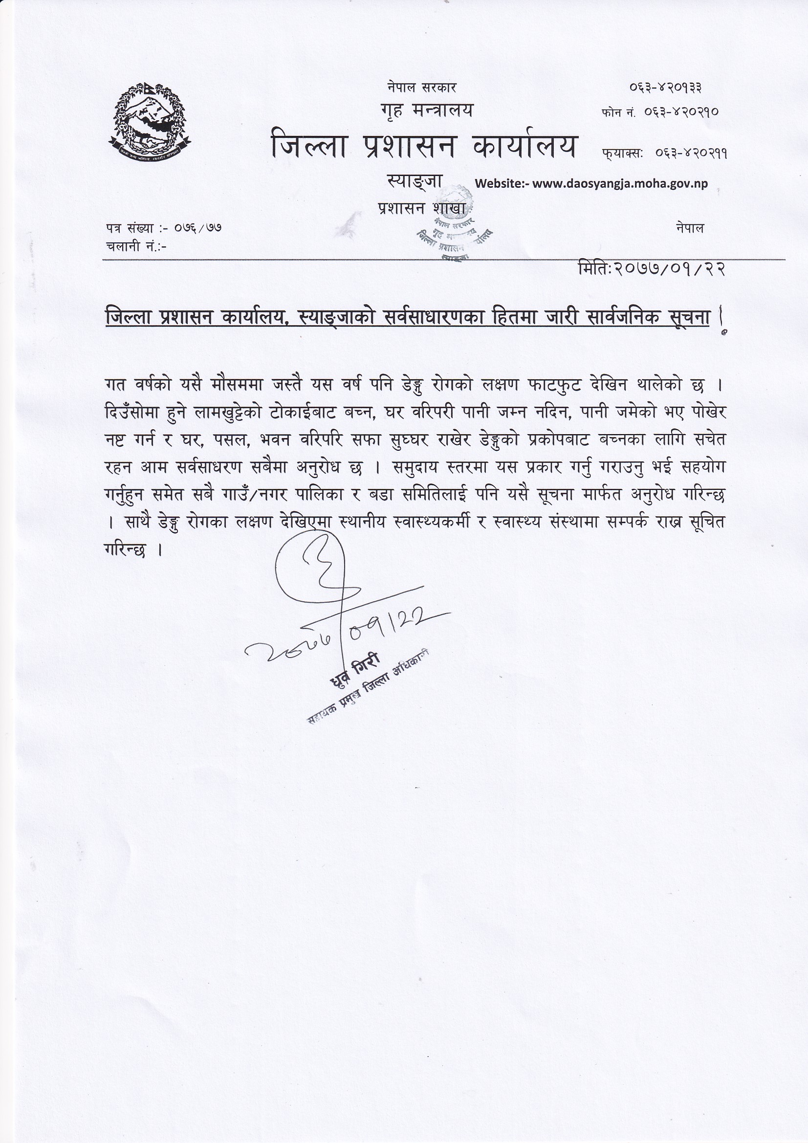 जिल्ला प्रशासन कार्यालय, स्याङ्जाको सर्वसाधरणका हितमा जारी सार्वजनिक सूचना