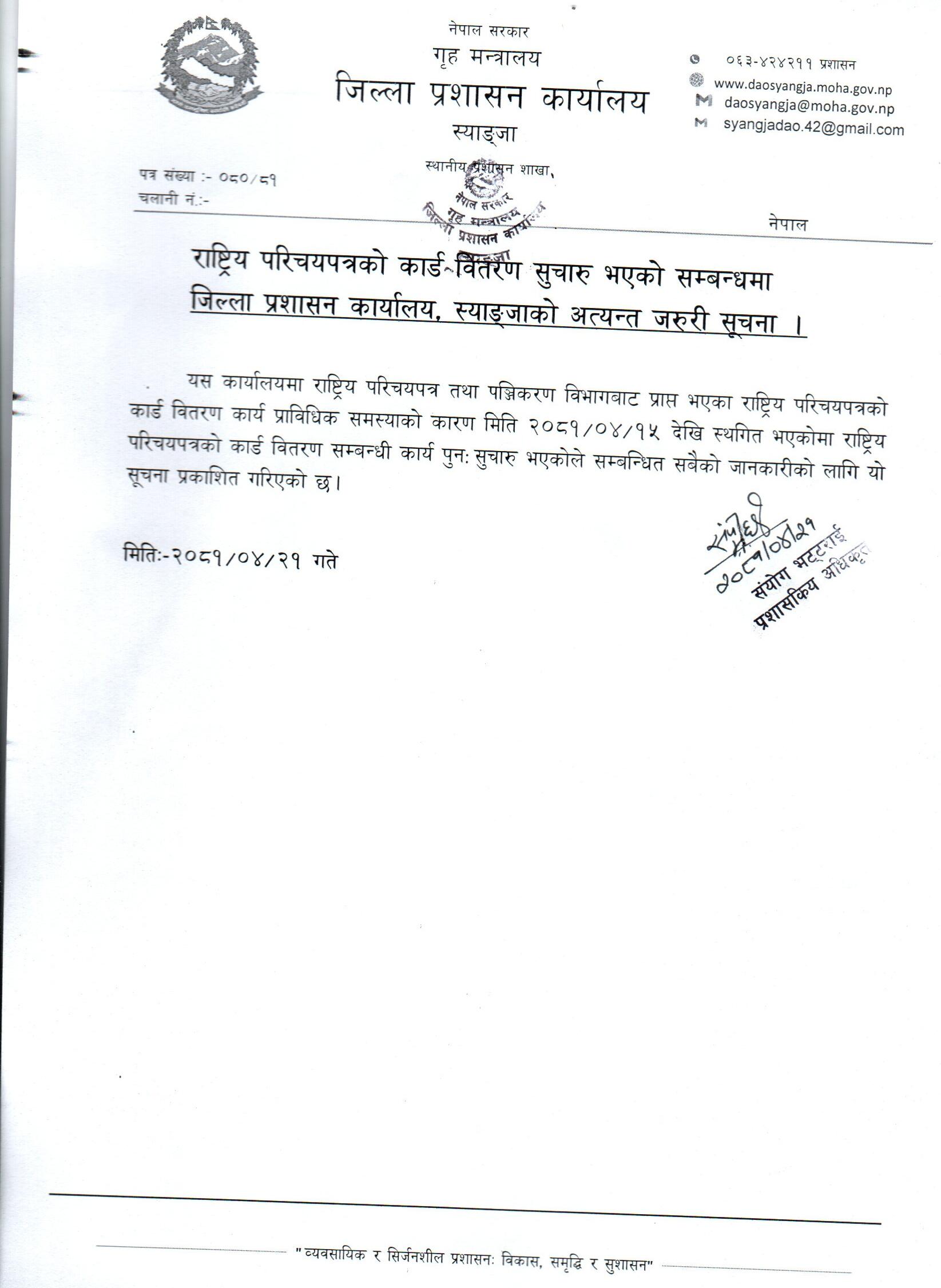 राष्ट्रिय परिचयपत्र कार्ड वितरण कार्य पुन: सुचारु भएको सूचना ।