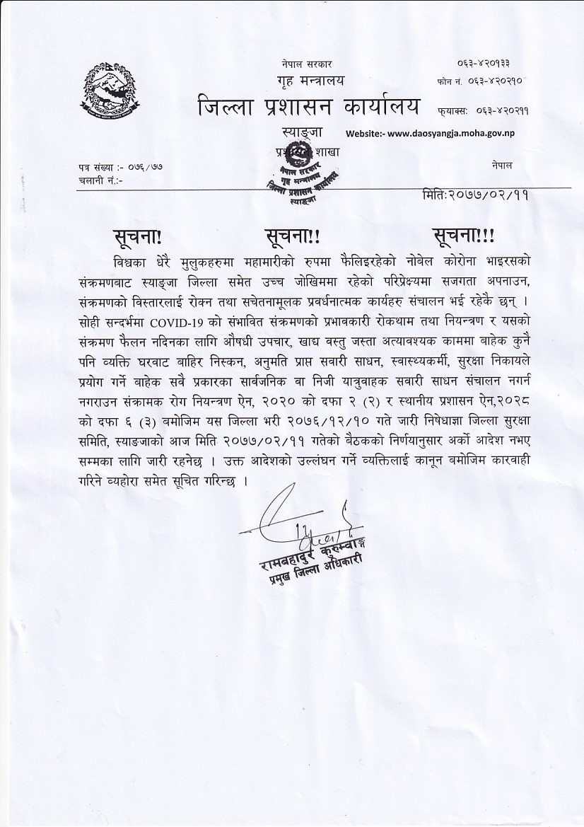कोभिड-१९ को रोकथाम र नियन्त्रणका सम्बन्धमा जिल्ला प्रशासन कार्यालय स्याङ्जाको जरुरी सूचना