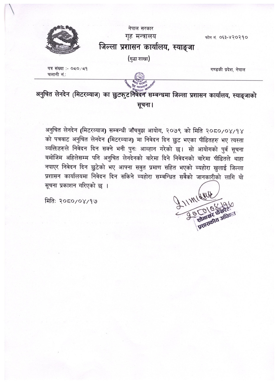 © सर्वाधिकार सुरक्षित जिल्ला प्रशासन कार्यालय, स्याङ्जा .