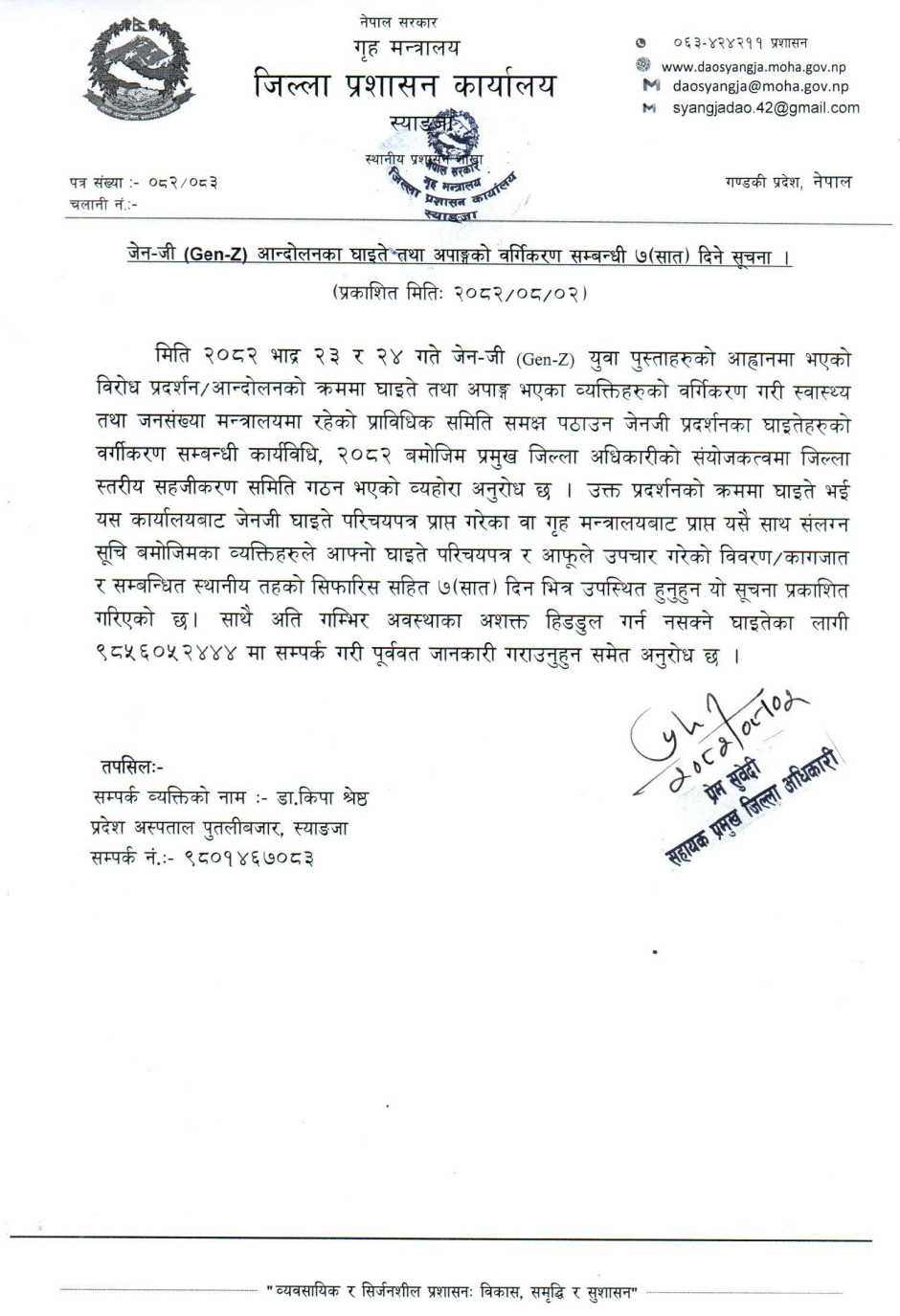 जिल्ला प्रशासन कार्यालय,स्याङ्जाको अत्यन्त जरुरी सूचना