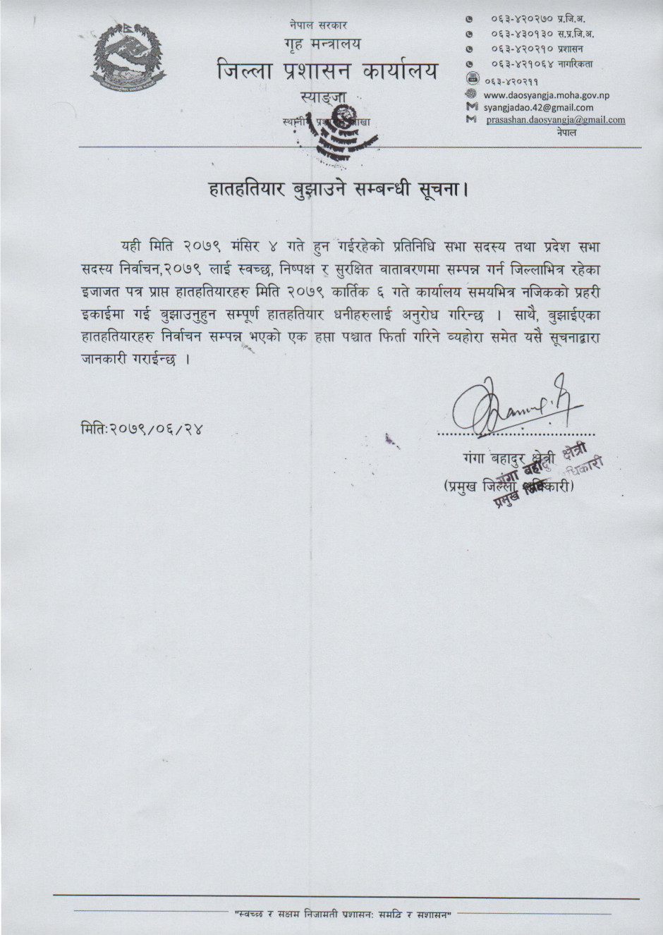 जिल्ला प्रशासन कार्यालय,स्याङ्जाको अत्यन्त जरुरी सूचना