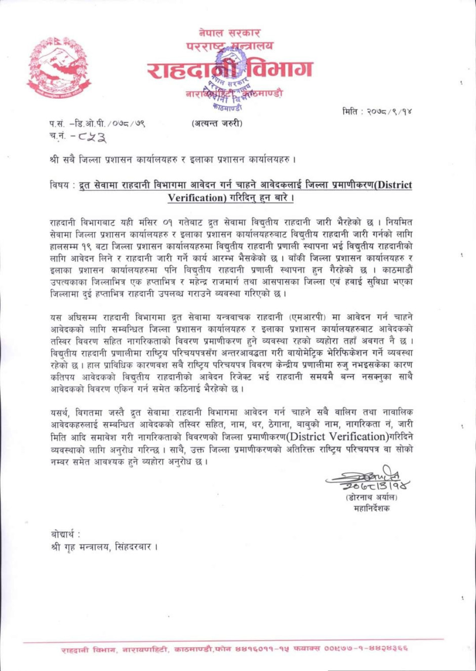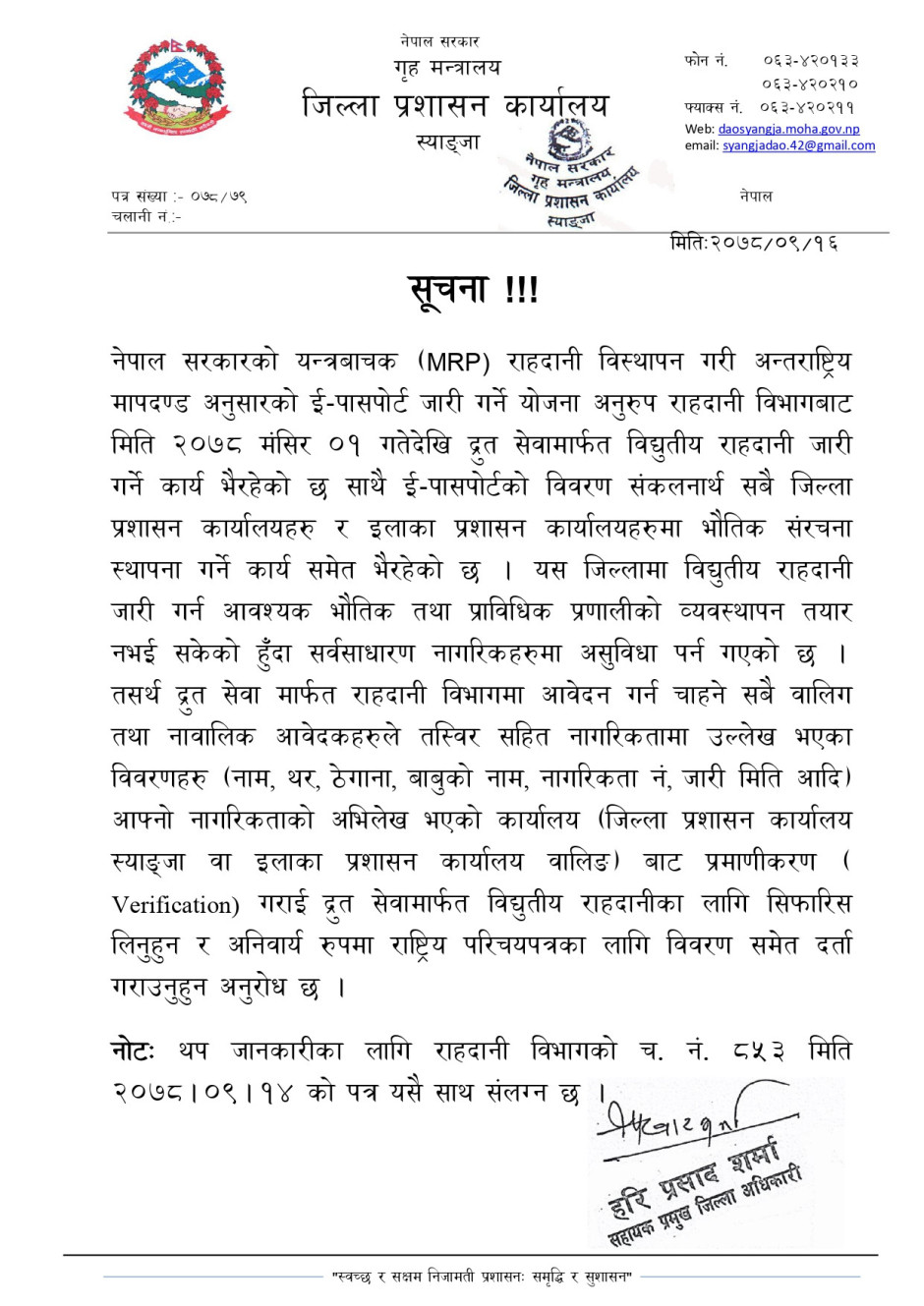 जिल्ला प्रशासन कार्यालय स्याङ्जाको विद्युतीय राहदानी सम्बन्धी जरुरी सूचना