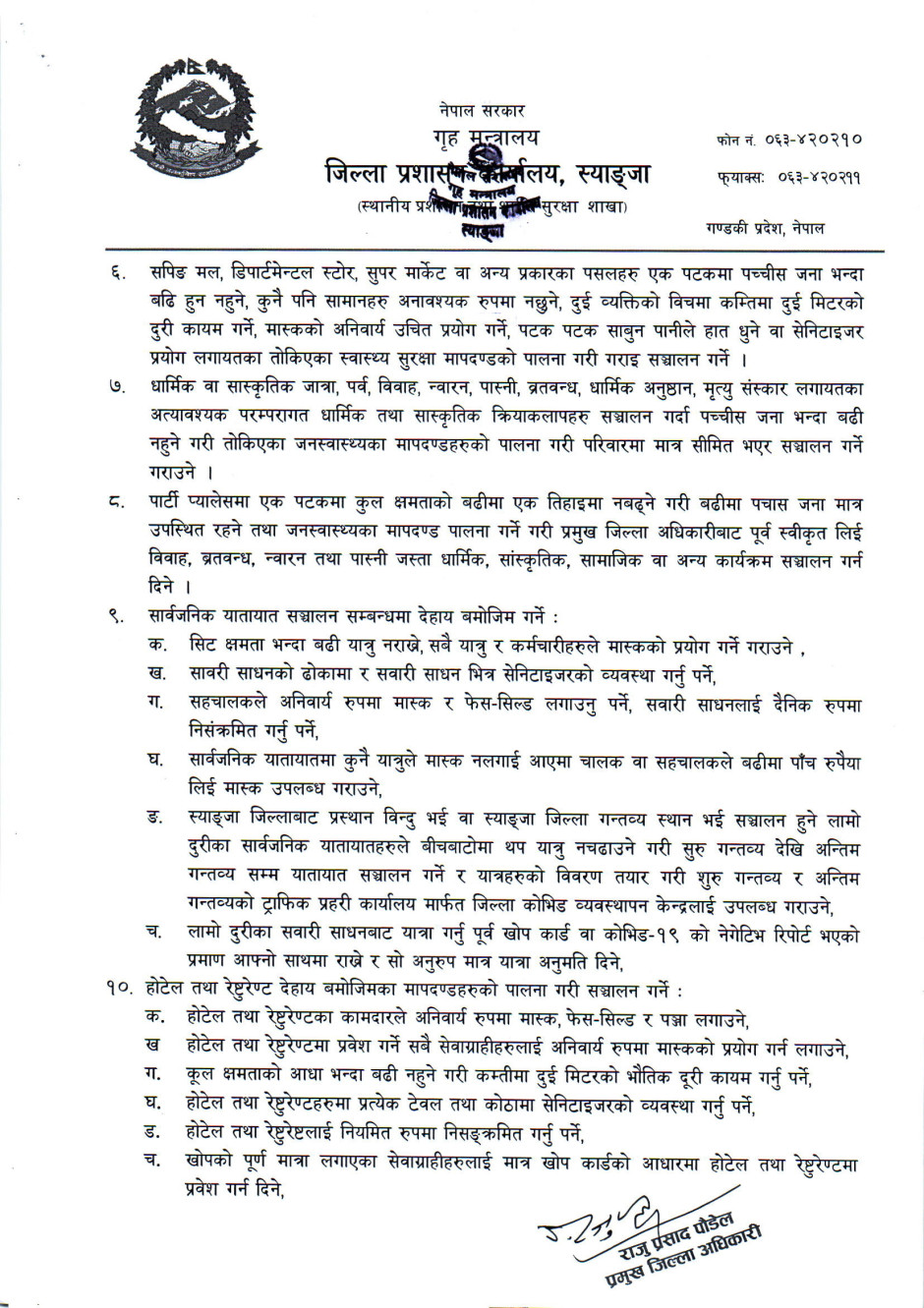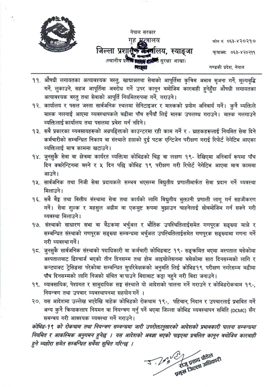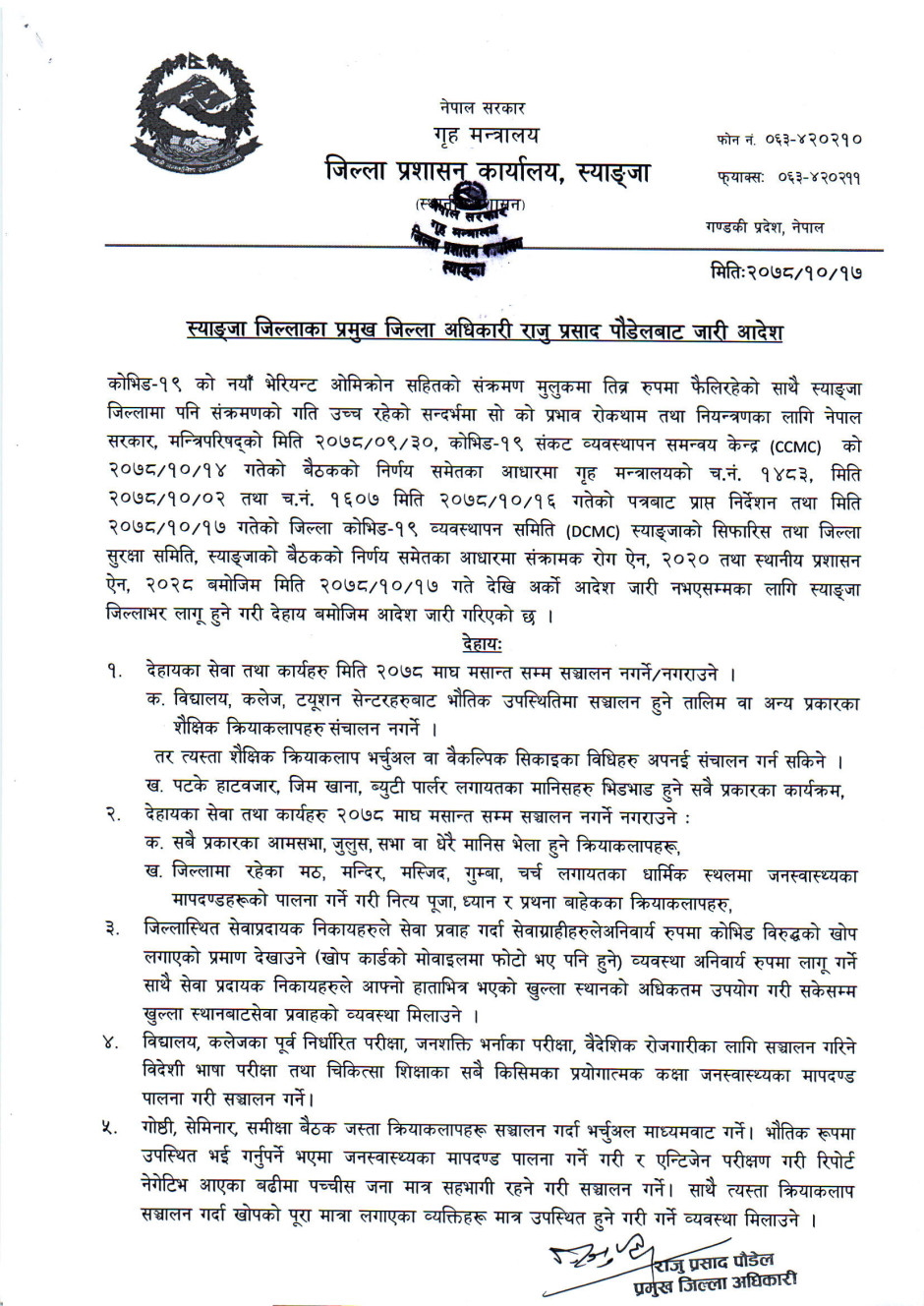 तस्बिर : कोभिड-१९ संक्रमण रोकथाम तथा नियन्त्रण सम्बन्धमा स्याङ्जा जिल्लाका प्रमुख जिल्ला अधिकारी श्री राजु प्रसाद पौडेलबाट जारी गरिएको आदेश
