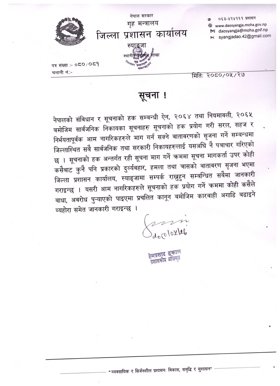 तस्बिर : सार्वजनिक निकायका सूचनाहरु सूचनाको हक बमोजिम सहज र सरलरुपमा उपलब्ध गराउने सम्बन्धी जिल्ला प्रशासन कार्यालय स्याङ्जाको जरुरी सूचना