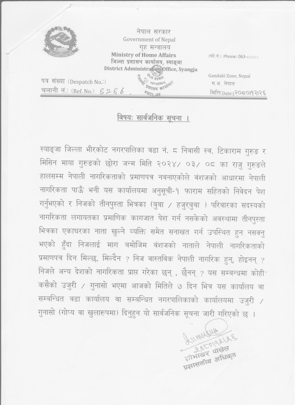 जिल्ला प्रशासन कार्यालय,स्याङ्जाको अत्यन्त जरुरी सूचना