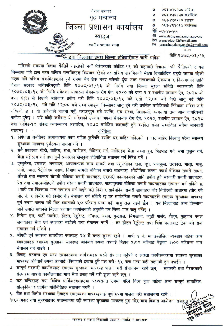 तस्बिर : स्याङ्जा जिल्लाका प्रमुख जिल्ला अधिकारीबाट जारी आदेश