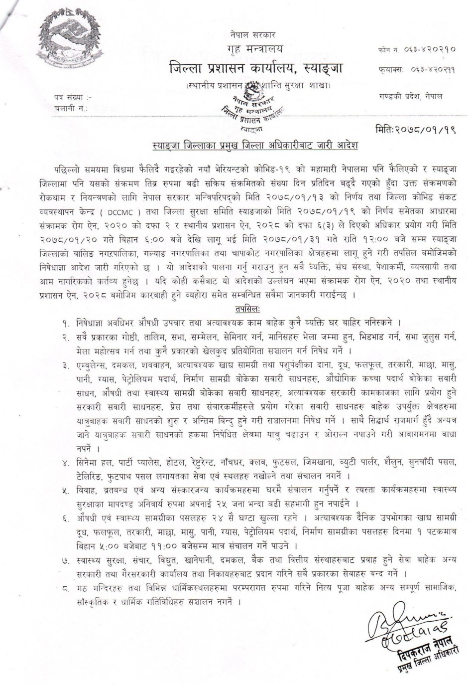 तस्बिर : स्याङ्जा जिल्लाका प्रमुख जिल्ला अधिकारीबाट जारी भएको आदेश