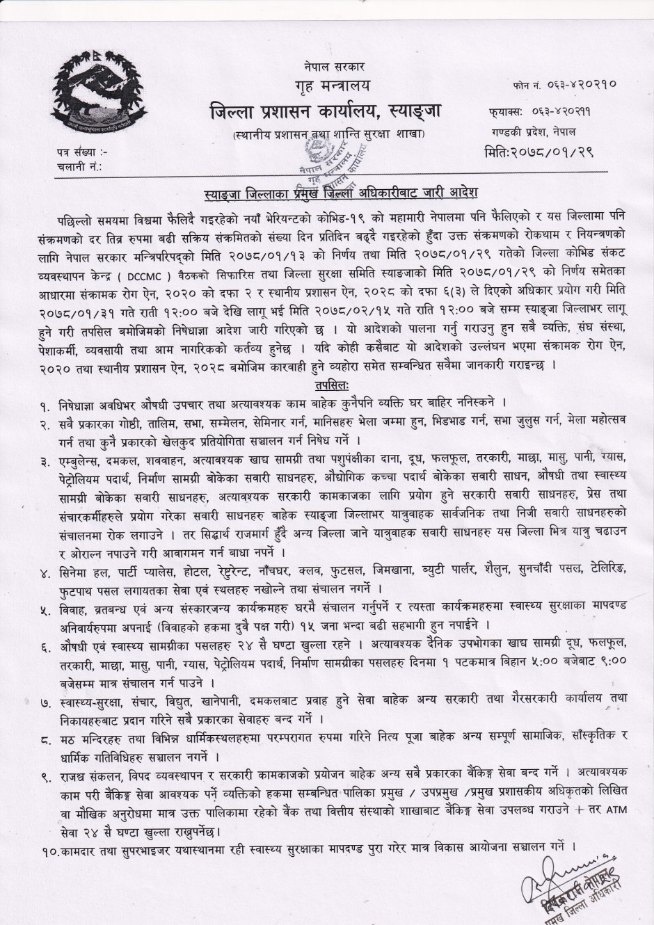 तस्बिर : स्याङ्जा जिल्लाका प्रमुख जिल्ला अधिकारीबाट मिति २०७८/०१/३१ गतेदेखि मिति २०७८/०२/१५ गतेसम्म लागू हुनेगरी जारी गरिएको निषेधाज्ञा